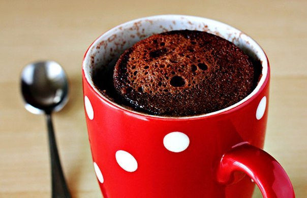 Все ингредиенты (кроме шоколадной стружки) поместите в миску среднего размера (можно замешивать сразу прямо в кружке). Перемешайте все ингредиенты венчиком. Затем переливайте получившуюся массу в керамическую кружку. Сверху посыпьте шоколадной крошкой. И выпекайте в микроволновой печи на максимальном режиме в течение 3,5 минут. Сначала кекс начнет подниматься, даже может немного начать переваливаться через край, но в итоге он снова осядет.