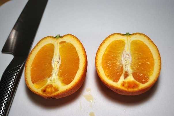 Когда все желе будет готово, нарезать апельсиновые половинки на дольки. Лучше всего это сделать теплым острым ножом. Нагреть нож можно под струей горячей водой и обязательно обсушить его.