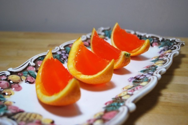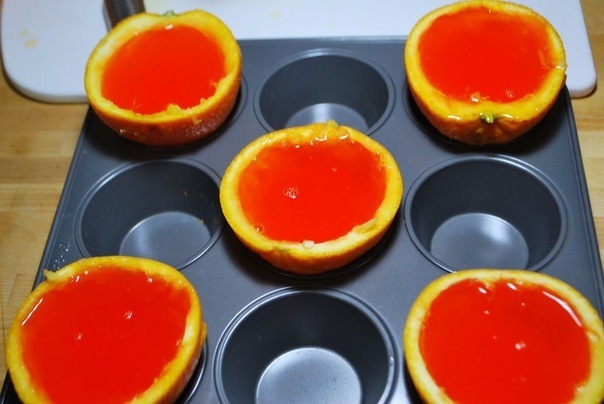 Залить желе в апельсиновые оболочки до самого верха.