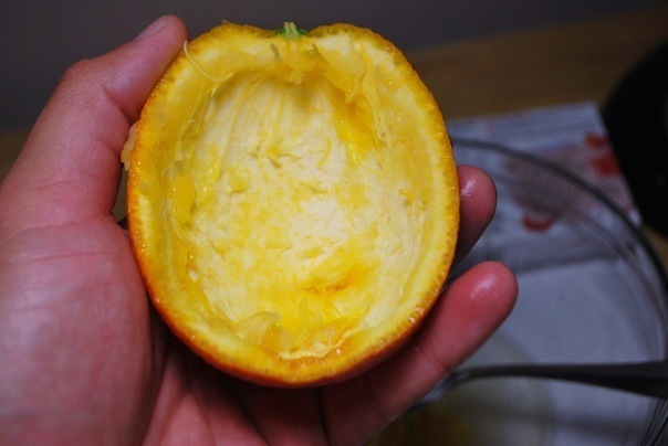 Разрезать апельсины вдоль пополам. Затем с помощью ложки удалить внутренности апельсина, оставляя только оболочку,главное не прорезать кожуру насквозь и конечно собрать весь сок.Выложить мякоть апельсина в соковыжималку,вскипятить один стакан воды.