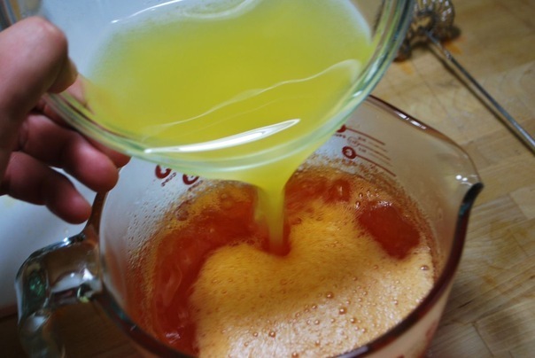 В большой миске смешать 2 упаковки апельсинового желе со стаканом кипятка и перемешать желе до растворения. Затем добавить водку, апельсиновый сок и холодную воду.