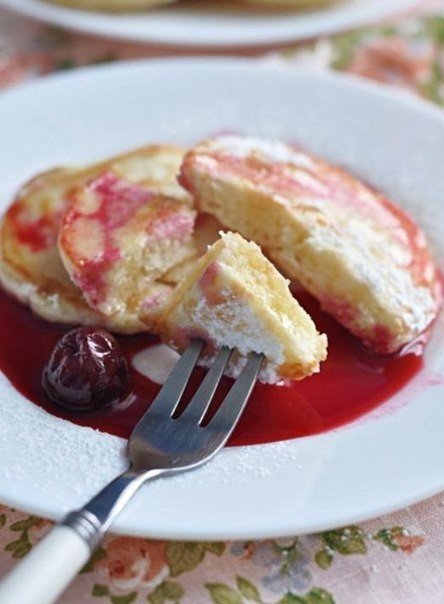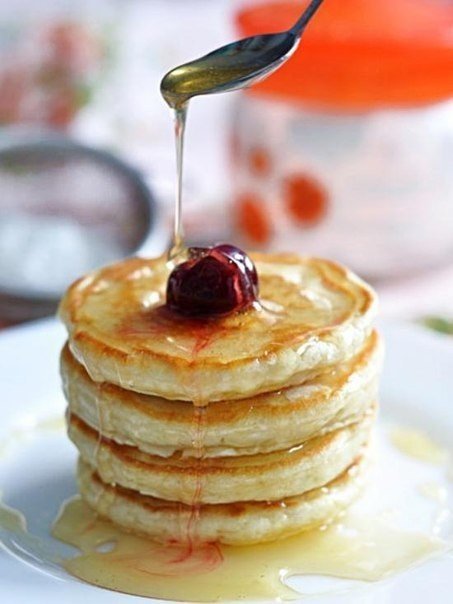 4. Поливаем наши оладушки (панкейки) вишневым соусом (или у кого, что есть — вкусненькое, подойдет даже сахарная пудра) и подаем к столу.