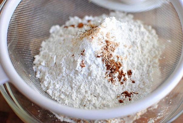 В миске смешайте просеянный коричневый сахар, муку, соду, разрыхлитель, соль, корицу и мускатный орех.