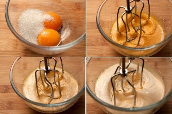 В эту же чашу, в которой до этого взбивались яичные белки, сложите желтки и сахар. Взбивайте около 5 минут на высокой скорости миксера или до тех пор, пока масса не посветлеет, не станет более пышной и легкой.