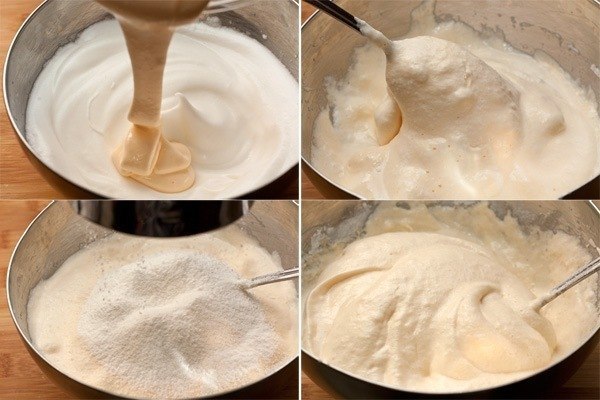 Введите 1/3 белков, перемешайте, облегчая тесто. Затем половину белковой массы и аккуратно перемешивайте, снизу вверх, чтобы тесто оставалось легким и воздушным. Затем примешайте и оставшиеся взбитые белки.