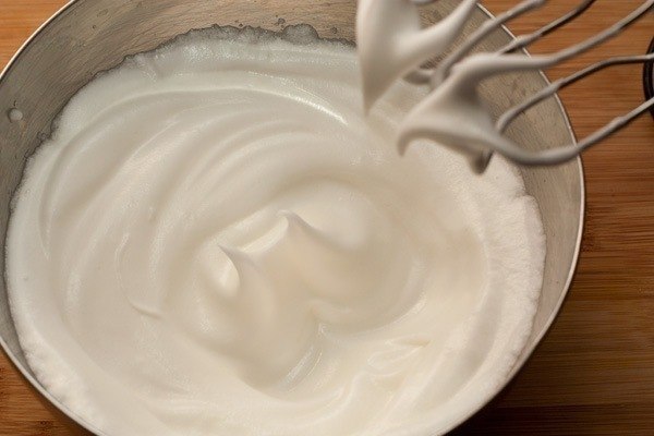 Взбейте белки до мягкой пены, постепенно всыпайте 1,5 ст. л. отложенного сахара. Продолжайте взбивать до устойчивых пик.