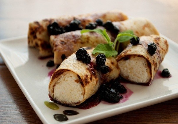 Теперь заворачиваем блинчики с творогом. Полить вкусным вареньем и наслаждаться!