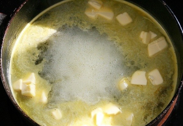 4. Выливаем смесь в холодную сковородку, добавляем сахарную пудру и, помешивая, нагреваем на медленном огне до растворения пудры. Затем добавляем сливочное масло. Мешаем до полного растворения масла и варим ещё 3-4 минуты при небольшом кипении.