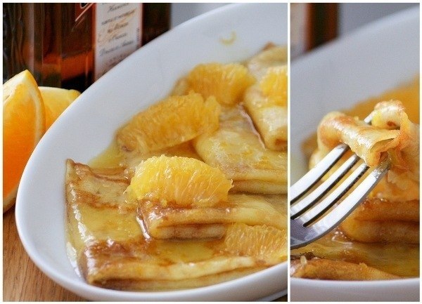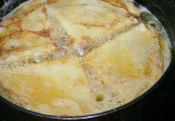 6. Прибавляем огонь и прогреваем блинчики 1 минуту. Затем сбрызгиваем блины коньяком и поджигаем с помощью длинной спички или свечки — фламбируем. Сразу же убираем с плиты. Тёплые блинчики выкладываем на тарелку.