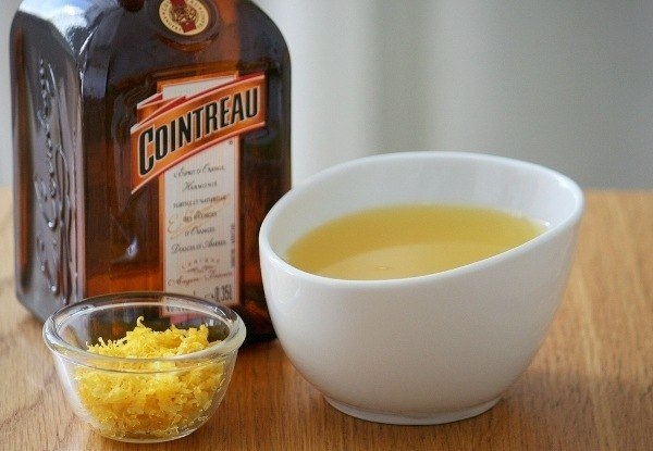 3. Для приготовления соуса смешиваем апельсиновый и лимонный соки, лимонную цедру и ликёр.