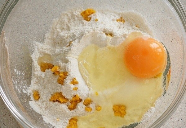 1. Соединяем в чашке муку, сахарную пудру (25г) и цедру 1 апельсина. В середину смеси разбиваем яйцо. Начинаем замешивать тесто, постепенно вливая половину молока. Размешиваем до полного исчезновения комочков. Вливаем оставшееся молоко и растопленное масло.