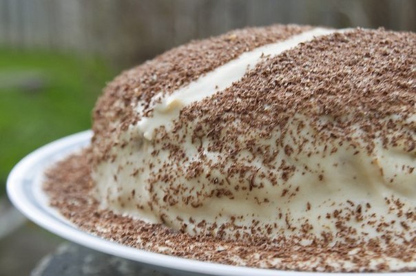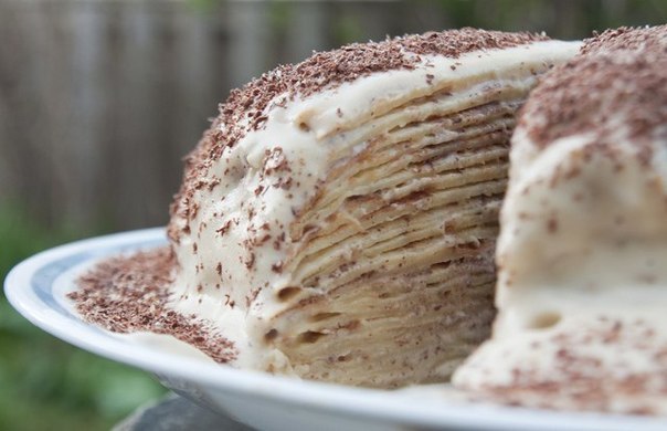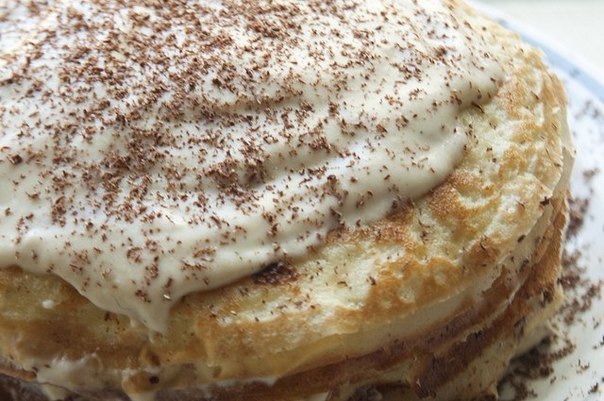 Нанесите крем между каждым слоем блинов. Поставьте торт в холодильник на час. Через час оставшийся крем нанесите поверх торта, сверху натрите шоколад и поставьте готовый торт в холодильник на 2 часа.