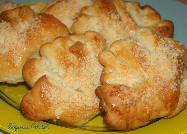 Тесто *Как пух* самое вкусное дрожжевое тесто! и самое быстрое!!! Потребуется: 1 стакан кефира,0,5 стакана раст.масла,1 ст.л.сахара,1 ч.л. соли,1 ст.л. сухих дрожжей,3 стакана муки( просеять!). Кефир с маслом вылить в кастрюльку, нагреть немного,добавить потом соль,сахар.Дрожжи перемешать с просеянной мукой и всыпать в кефирную массу.Замесить тесто,дать постоять 30 минут.Всё!!! Можно лепить пирожки или булочки! Печь при 180 гр. .Для *Лапок * тесто нужно разделить на шарики ,раскатать каждый отдельно,смазать растопленным сливочным маслом,посыпать сахаром,свернуть вдвое,потом ещё свернуть вдвое и сделать надрезы с круглой стороны.Смазать льезоном и посыпать кондитерской крошкой: слив.масло,сахар,мука ,всё перемешать до состоянии крошки.