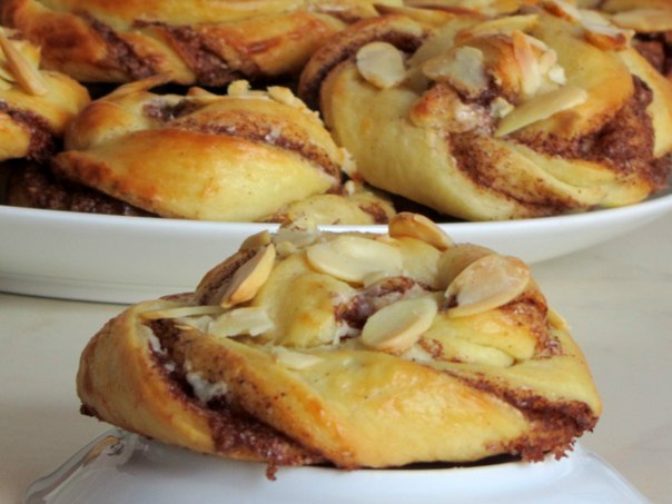 Тонко раскатать тесто (1-2 мм толщиной) в прямоугольник. Мысленно разделить его на 3 части вдоль. Среднюю обмазать половиной коричной смеси. Накрыть боковой частью. Намазать эту накрытую часть коричной смесью, и накрыть последней третьей частью. Разрезать на 15 поперечных полосок. Из каждой полоски связать узелок.