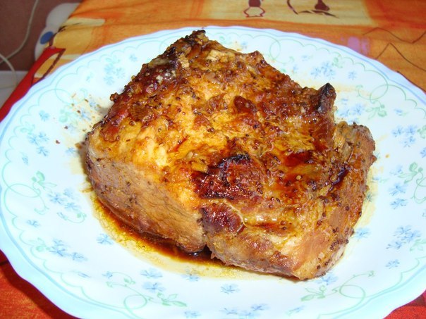 Приготовление: свинину (карбонад,корейку или шейку(я обычно беру килограмма на 1,5-2,потому как получается вкусно и меньший объем ооооочень быстро исчезает)) нужно замариновать с вечера или даже лучше на 24 часа,для этого ее хорошо вымыть,обсушить бумажным полотенцем,сделать небольшие дырочки ножом для чеснока,посолить,постараться чтобы в дырочки тоже соль попала,после этого запихать туда дольки чеснока,в отдельной емкости(я делаю сразу в большой тарелке,в которой мясо будет стоять в холодильнике) смешать маринад- французскую горчицу 2-3 ст ложки смешать с медом,его нужно примерно 2 ст ложки,в этот раз я еще паприки добавила)))),все хорошо перемешать и обвалять кусок мяса в этом маринаде,затянуть пленкой и поставить в холодильник,если есть возможность раза 2-3 перевернуть в процессе маринования,на следующий день перед запеканием обернуть мясо в 2 слоя фольги (обязательно полить сверху образовавшимся соком),плотно ее прижимая,затем положить в рукав для запекания,и в противень,выпекать от полутора до двух часов(зависит от кусочка,я выпекала час сорок) при температуре 180 градусов,затем разрезать пакет и фольгу посередине,развернуть,полить соком и запекать еще минут 20-30 до румяной корочки,приятного аппетита)))