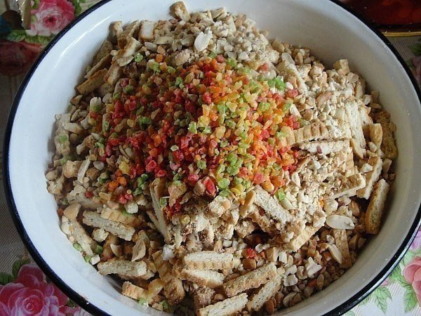 4. Смешиваем печенье с орехами. Если нашли цукаты — пару ложек и все старательно перемешивайте.