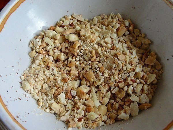 2. Берем арахис (самый дешёвый и доступный орех), обжариваем на сухой сковородке – жареные орехи всегда вкуснее и ароматнее сырых. Почистим их от шкурок и измельчим кухонным молоточком.