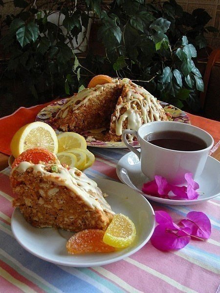 8. Выложить массу на блюдо и сформировать горку. Украсим мармеладками, орешками и растопленным шоколадом. Убираем в холодильник на застывание на пару-тройку часов.