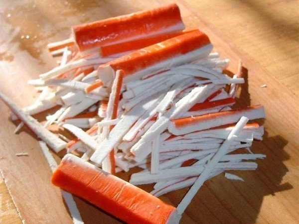 Крабовые палочки нарезаем соломкой и обжариваем на растительном масле.