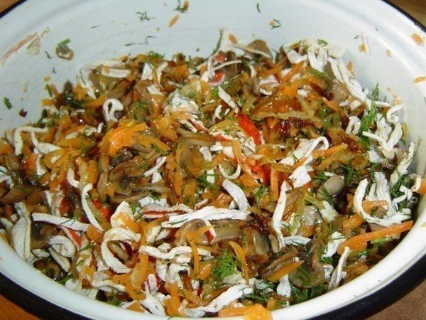 Соединяем грибы, лук, крабовые палочки, к ним добавляем отварную морковь, натертую на крупной терке, и мелко нарубленный укроп, все перемешиваем, а затем заправляем оливковым маслом и еще раз перемешиваем.
