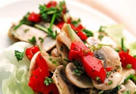 5. На тарелку выложить листья салата, сверху грибы с перцем, посыпать зеленью и полить заправкой.