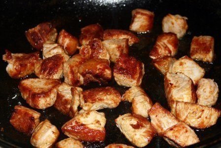 Поджарьте мясо на небольшом количестве подсолнечного масла до готовности, примерно 20-25 минут. Посолите и поперчите.