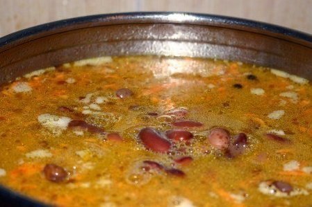Сюда же добавьте отваренную фасоль и жареные лук с морковью.