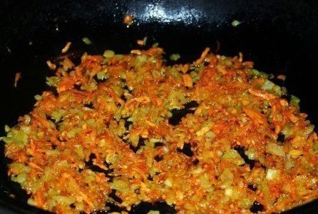 Лук нарежьте кубиками, а морковь натрите на терке.