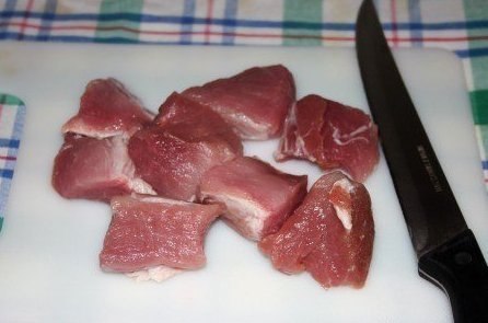 Картошку нарежьте крупными кусками, такими же как и мясо.
