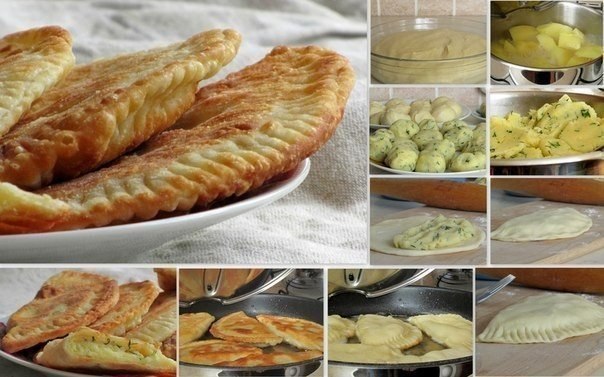 Каждый кусочек теста раскатываем в лепешку размером 10-15 см. На край лепешки кладем начинку, складываем пополам, прижимаем пальцами и придавливаем вилкой.