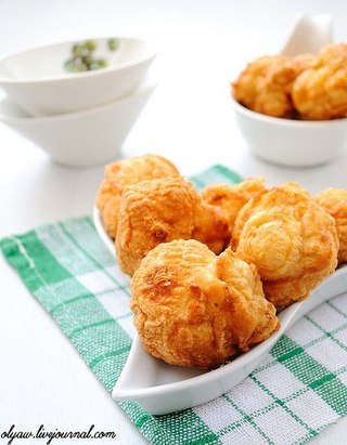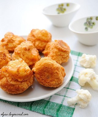 а лучше сделать так. яйцо взбить с солью и чесноком, туда соцветия капусты.потом в панировочные сухари(такие рыжие) и во фритюр. приятного аппетита!!!