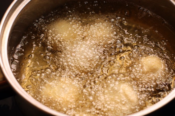 В сотейнике разогрейте масло для фритюра. Опускайте туда шарики небольшими порциями (5-7 штук) и жарьте до светло-золотистого цвета около 3 минут.