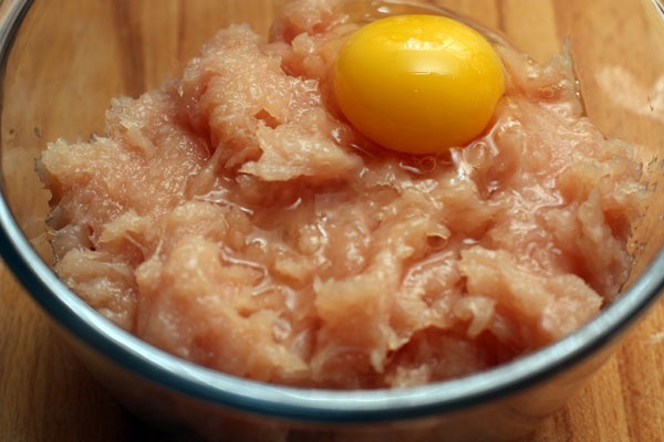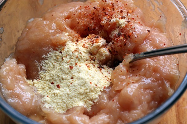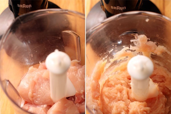 Из куриного филе сделайте однородный фарш с помощью блендера.