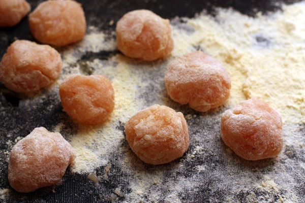 На посыпанной мукой поверхности скатайте шарики размером чуть больше грецкого ореха. Для каждого шарика надо брать чайную ложку смеси.