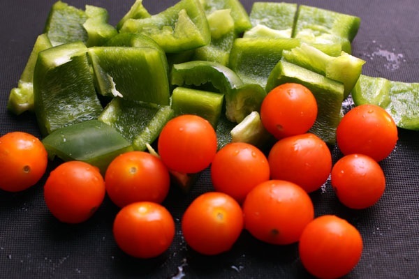 Перец нарежьте квадратиками размером примерно с крокет. Вымойте и подсушите черри.
