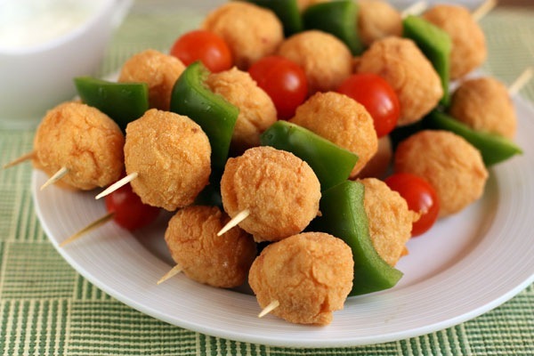 Нанизывайте крокеты на деревянные шпажки вперемежку с овощами. Есть крокеты лучше сразу, пока они теплые.
