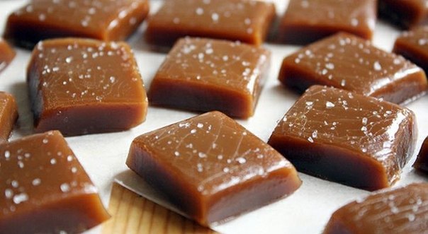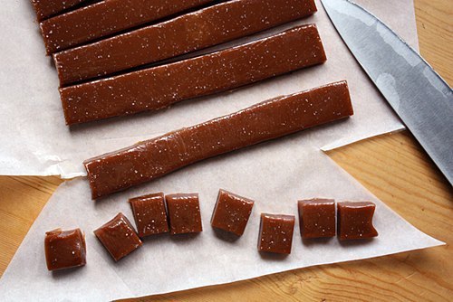 5. Вынимаем карамель из противня с помощью пергаментной бумаги. Очень острым теплым ножом разрезаем карамель на 3-х сантиметровые конфеты.