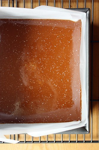 4. Выливаем смесь на противень и даем ей остыть около 2 часов. Через полчаса после заливки посыпаем карамель морской солью (по желанию).