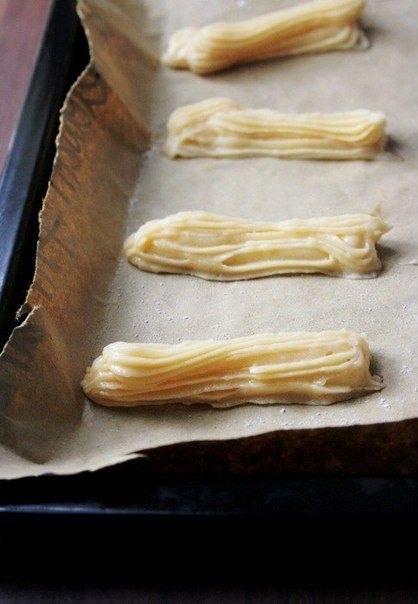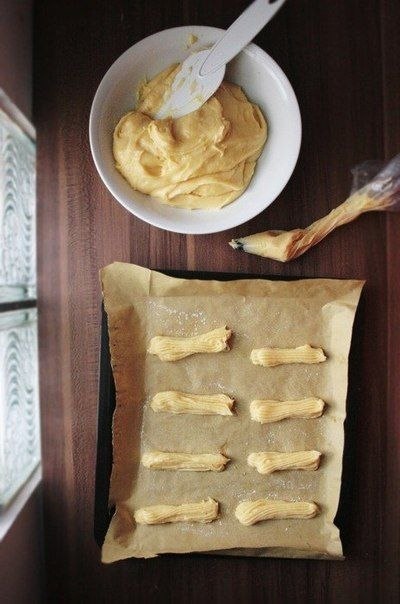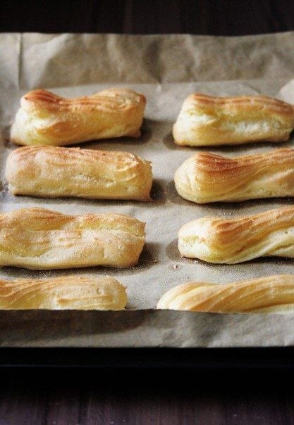 2. Переложите тесто в чашу для миксера, вбейте яйца, замесите тесто. Переложите его в кондитерский мешок. Выдавите примерно 8-10 эклеров на каждый противень, оставляя достаточно места между ними. Выпекайте 25-30 минут. Остудите.