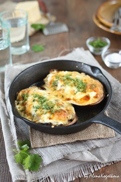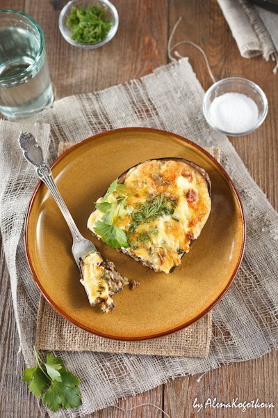 5. В «лодочки» слоями выложить: фарш, баклажаны, грибы. Сверху посыпать тертым чесноком. Запекать при 200 С около 10 минут. Залить баклажаны сметаной, присыпать тертым сыром и мелко порубленной зеленью. Запекать при 200 С еще 10 минут.