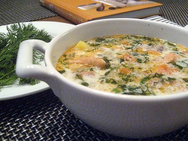 6. В конце добавьте сливки или молоко, смешанные с мукой, порванный руками укроп. Досолите, если нужно. Доведите до кипения, снимите с огня. Накройте крышкой и оставьте постоять пять минут.