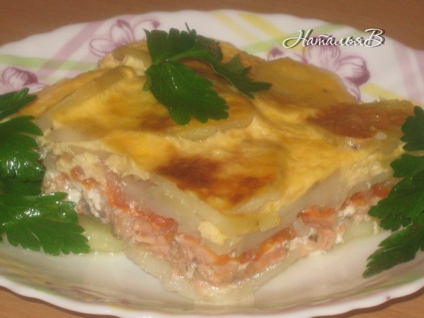 Картофель очистить и нарезать тонкими кружочками, помидор, лук — соломкой, рыбу — небольшими кусочками(кубиками или полосками). Уложить в форму для запекания: 1/2 картофеля(посолить, поперчить) — рыба(посолить, поперчить) — помидор, лук(посолить) — остатки картофеля (посолить, поперчить), налить до половины воды, накрыть фольгой и в духовку 190градусов — 40минут. Сделать соус: на масле обжарить чеснок, влить в него смесь из сливок и желтков, нагревать на небольшом огне, пока масса не загустеет, затем добавить натертый сыр и проварить соус до полного расплавления сыра.