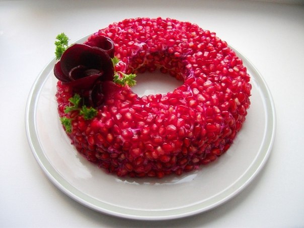 салат действительно очень вкусный и красивый!!! «Браслет» красив как правильно сказали, пока на начнешь его есть! У нас такой салат называется «Шапка Мономаха», все овощи сырые, только картофель отварной, морковку сразу в блендере с луком делаю….курица отварная, а сверху гранат именно с косточками — он как рубины смотрится на «Шапке» и когда ешь салат выложенный послойно…он как торт…выглядит эстетично до последнего куска!!! )))