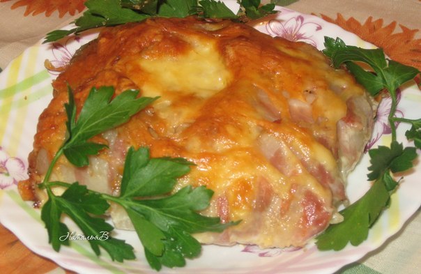 Форму для запекания выстелить полосками бекона ( они должны закрыть бортики формы и немного свисать — поэтому подобрать соответствующую форму), уложить картофель, слегка посолить, поперчить, посыпать мускатным орехом, сверху уложить грибы с луком, немного посолить, поперчить, затем все залить сливками и закрыть свисающими полосками бекона, сверху посыпать сыром и поставить в духовку 200 градусов — 20-30 минут до румяной корочки. При подаче нарезать на порционные кусочки, украсить зеленью. Приятного аппетита!