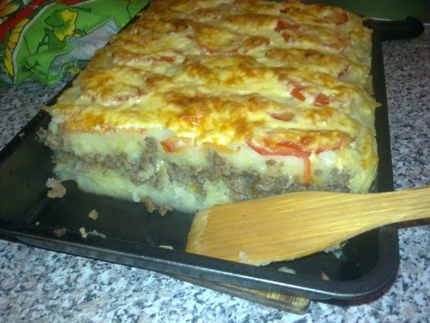 Противень для запекания хорошо смазать сливочным маслом. Выложить слой где-то из половины толчёной картошки.