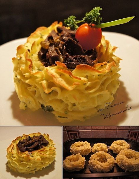 Форму для запекания смазать маслом.С помощью кулинарного шприца создаем кружочки из пюре, наполняем начинкой. Подрумяниваем в духовке при температуре 180-200 градусов .