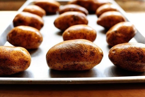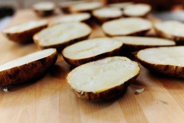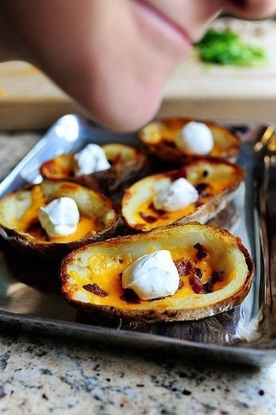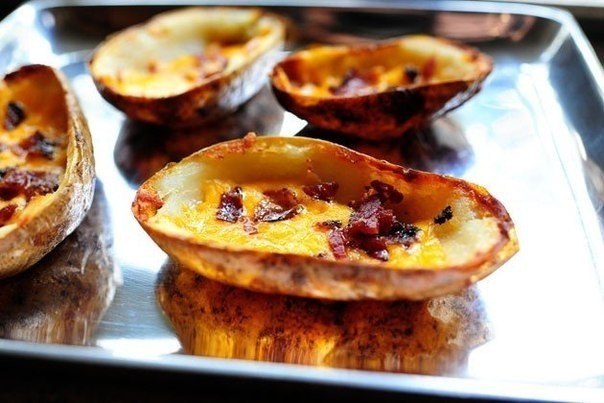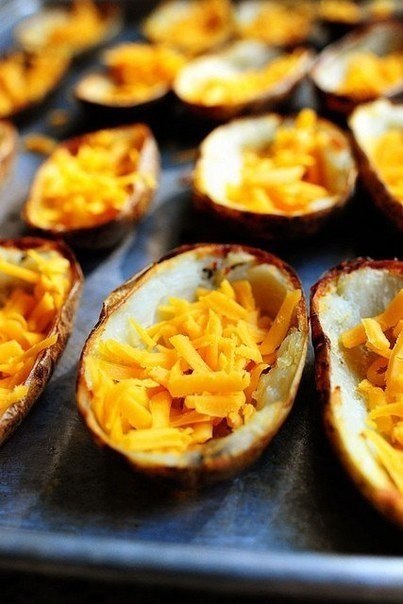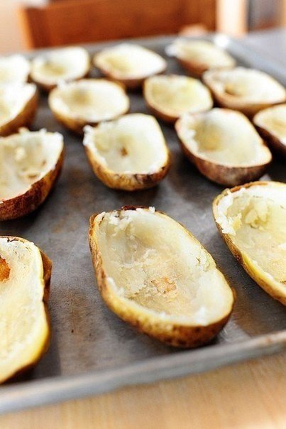 — Разрезать картофель вдоль пополам. Каждую половинку очистить от мякоти, оставив только кожуру и немножко мякоти по бокам. Снова смазать картофель маслом, посыпать слегка солью и вернуть в духовку на 5-8 минут, пока края картофельной лодочки не станут золотисто-коричневыми.
