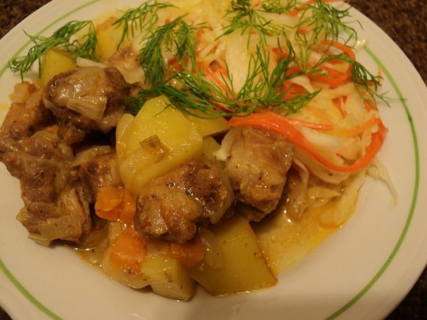 700 г мяса (например, свиная шея и вырезка — 1/1), 5 средн. картофелин, один болгарский перец, большая луковица, 2 зуб. чеснока, соль и с/м белый перец.