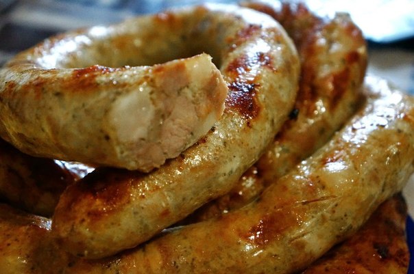 Свинина, черева свиная, свиное сало, кориандр, чёрный и душистый перец, чеснок и соль (всё по вкусу). Жарить или в духовке или на сковороде. Подавать как в горячем, так и в холодном вид