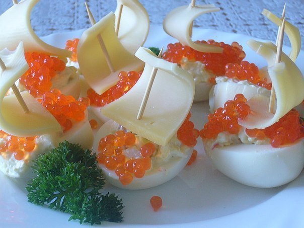 Вырезаем тонкие полоски сыра прямоугольной или треугольной формы и накалываем на зубочистку или шпажку, в виде паруса и втыкаем в половинки яиц.